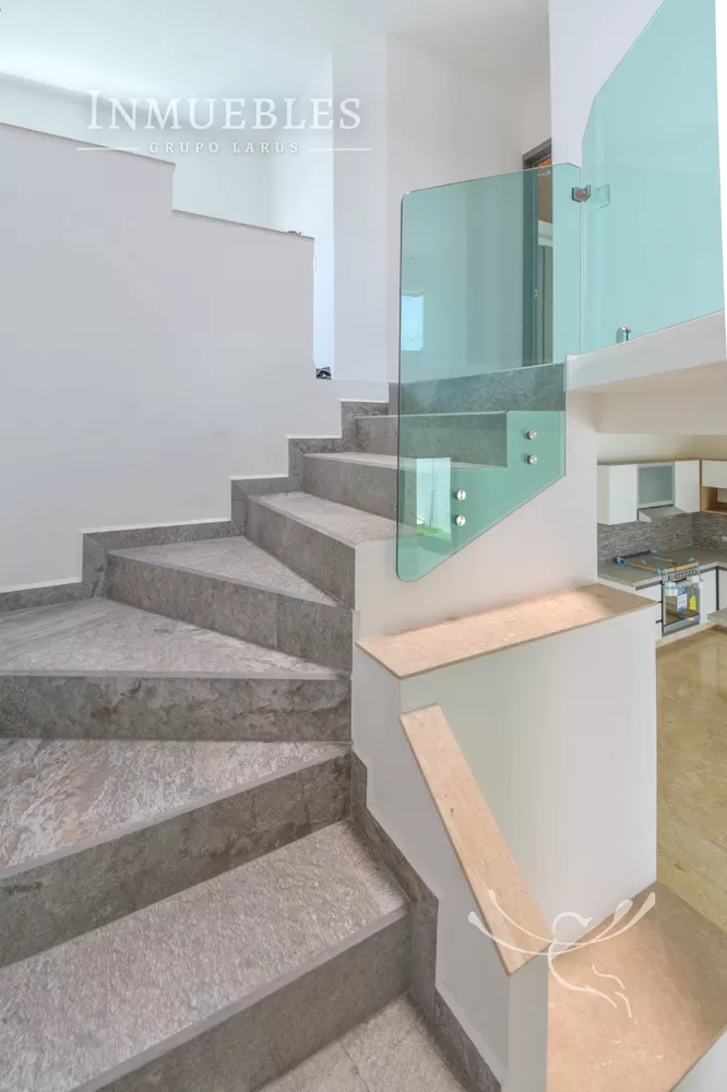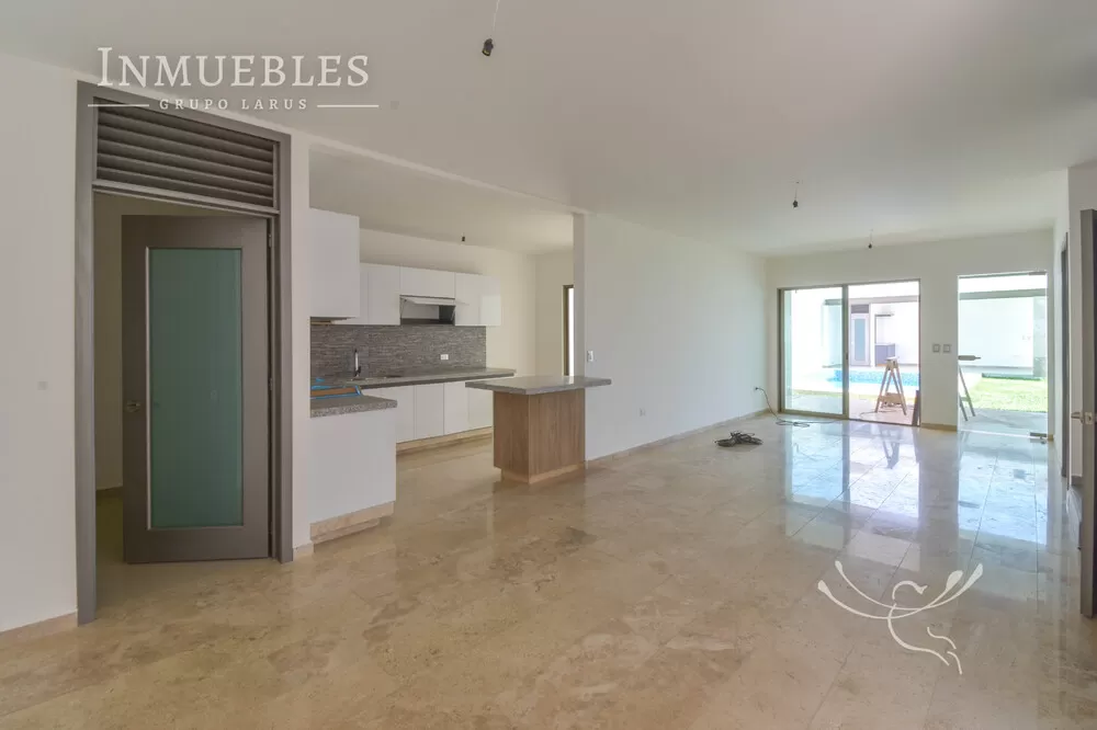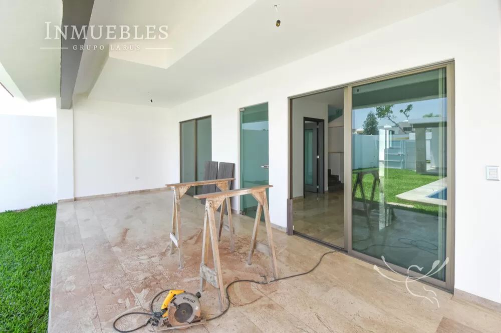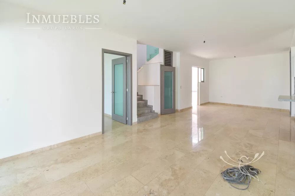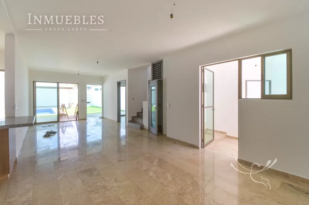 La planta baja cuenta con una amplia sala, cocina integral equipada con barra de granito, una recámara con baño completo, medio baño para visitas, área de lavado, cuarto de servicio y terraza con vista al jardín. El diseño incluye pisos de mármol y acabados de excelente calidad.